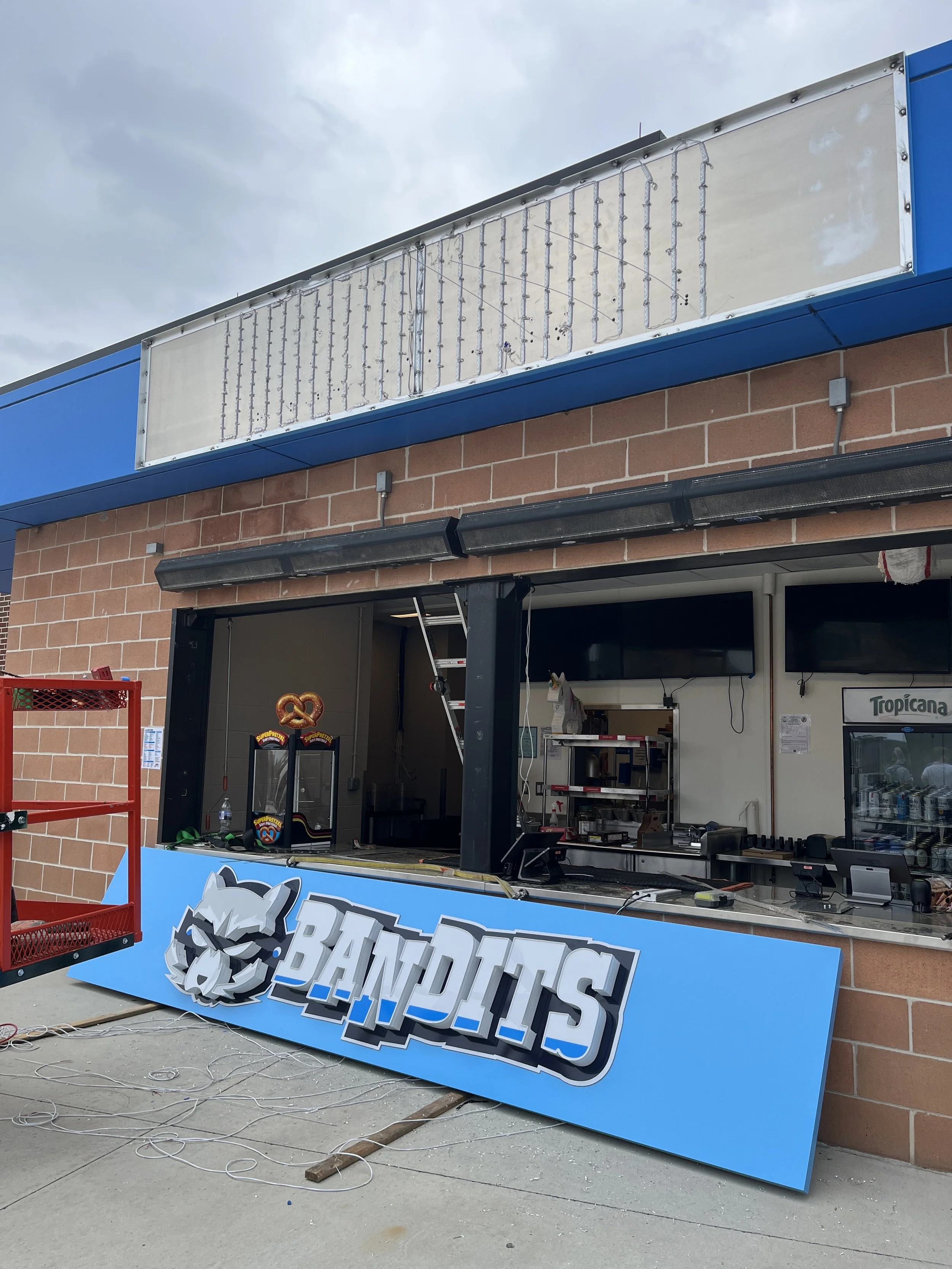 This project, titled, “Bandits", involved the development of a refreshed storefront identity for a concourse concession stand at Toyota Field, centered around a custom mascot-inspired alternate mark. The design was approached as an opportunity to reimagine an outdated visual presence with a bold, contemporary solution that prioritizes clarity, personality, and environmental impact. By integrating dynamic geometry, playful visual cues, and refined typographic treatment, the logo establishes a distinct brand voice that stands apart from neighboring concessions while remaining cohesive within the broader ballpark experience. The illuminated signage further enhances visibility and legibility in low-light conditions, transforming the mark into a beacon that glows at night. This redesign not only modernizes the stand’s identity but also reinforces its role as an engaging, memorable touchpoint within the fan experience.