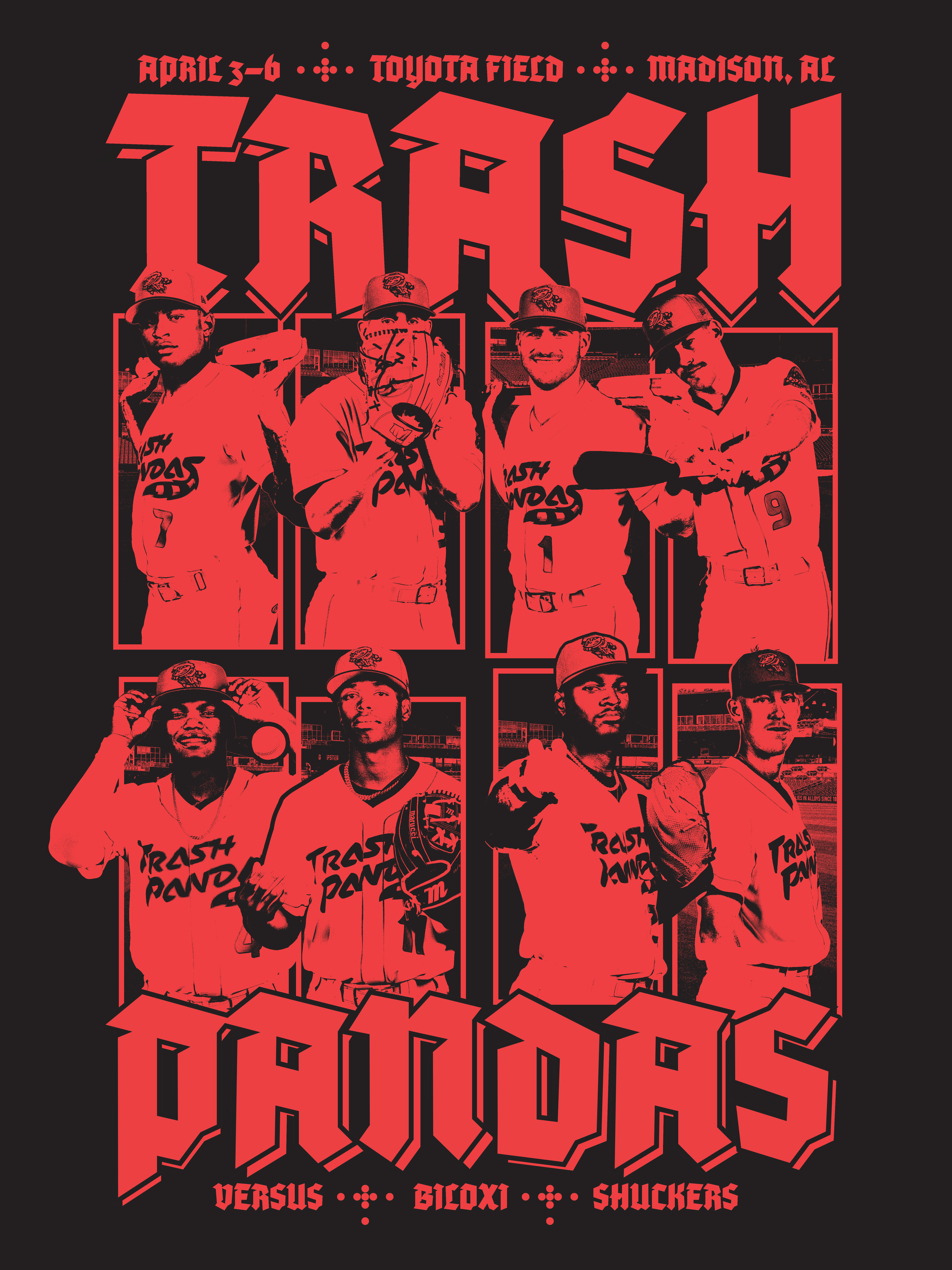 The 2026 Trash Pandas pocket schedule expands on the social visual system I developed during the off-season, refined and simplified specifically for print. The goal was to create a piece that felt bold, highly scannable, and visually impactful at a small scale.